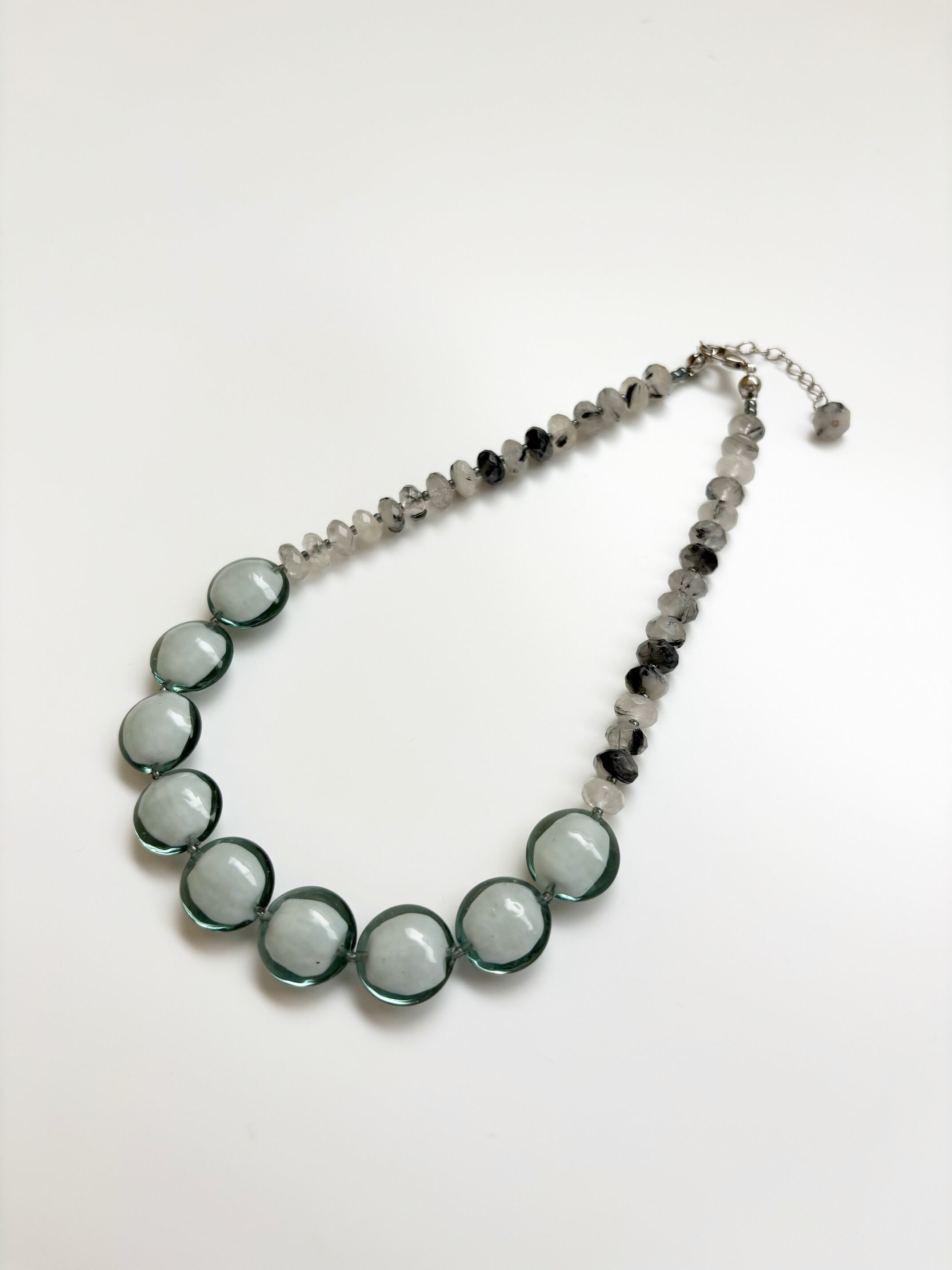 (色)グレー (素材)真鍮金具、ベネチアンガラス、ガラス、針水晶 (サイズ)約36.8cm、アジャスター約5cm